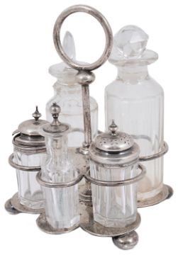 of plain cinquefoil form with five ring compartments for five cut glass bottles, three with silver fittings, having central ring carrying handles, on compressed ball feet