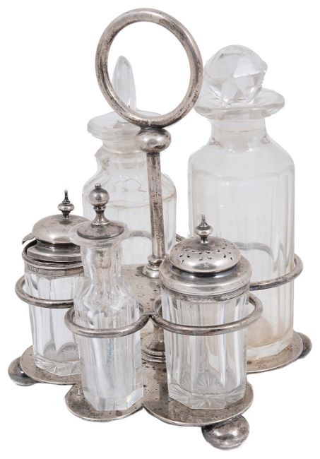 Condition: Fair condition. Stand with occasional black corrosion spots. Salt bottle with chips to glass rim of bottle. Silver gilt spoon with salt corrosion.
