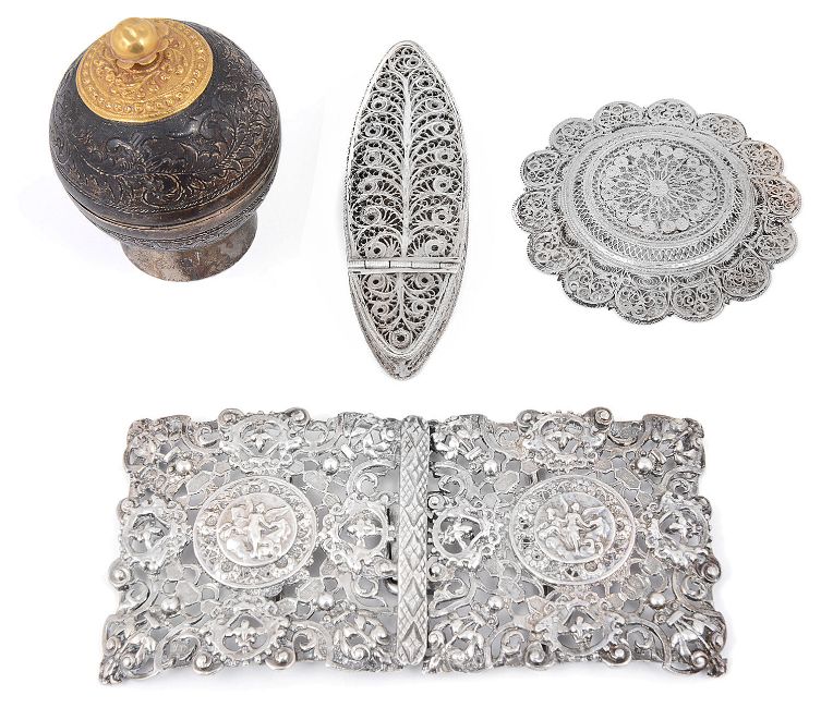 the buckle, London, 1895 by William Comyns, together with an the Indian footed pot of spherical form engraved with scrolling leaves, the lid having yellow metal applied finial, a navette shaped filigree toothpick case with hinged lid and a miniature filigree plate, (4)