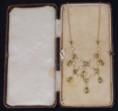 An attractive Edwardian peridot and seed pearl drop necklace