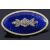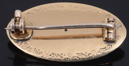 the deep blue enamel oval brooch with rose diamond set floral centre with white enamel and gold detail to border, the yellow metal back engraved with letters and scrolls and partial date, tests for gold