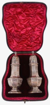 of octagonal baluster form, having lift off pierced domed covers with lobed finials on a spreading foot, in original fitted case