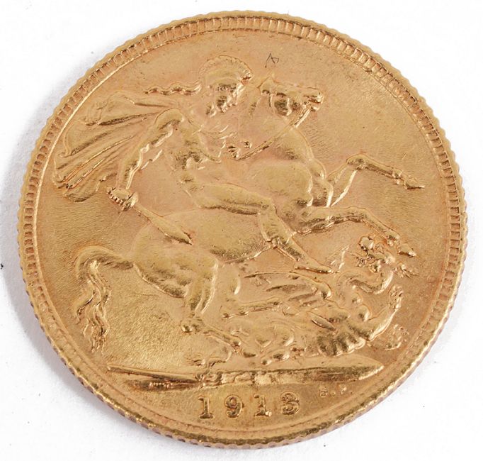 gold coin 0.916, Obverse: uncrowned head of King George left, GEORGIUS V D.G.BRITT:OMN:REX F.D.IND:IMP:, Reverse St George slaying the dragon
