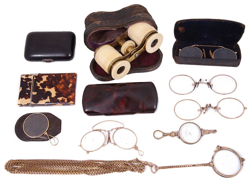 Condition: One silver corner of the card case replaced. hinged cover. Hairlines to ivory of opera glasses. Ebony cigarette case previously with mount to front cover. Folding lorgnette with one lens cracked, gilt worn. Some wear to gilt on spectacles