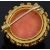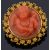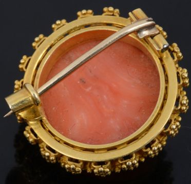 the circular brooch set with a carved coral cherub in high relief within an Etruscan style yellow metal brooch mount, tests for gold