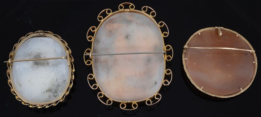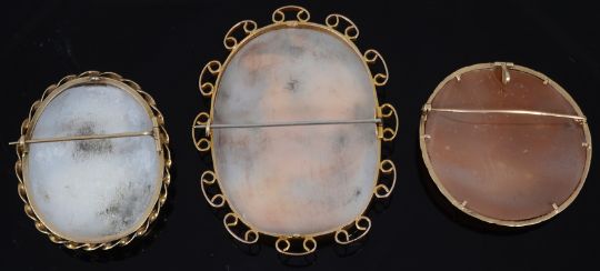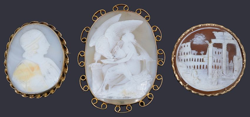 one with a relief portrait of a classical figure, another with a portrait of the Colosseum and another with a carved portrait of Zeus and Semele, three in marked 9ct frames the other tests gold (3)