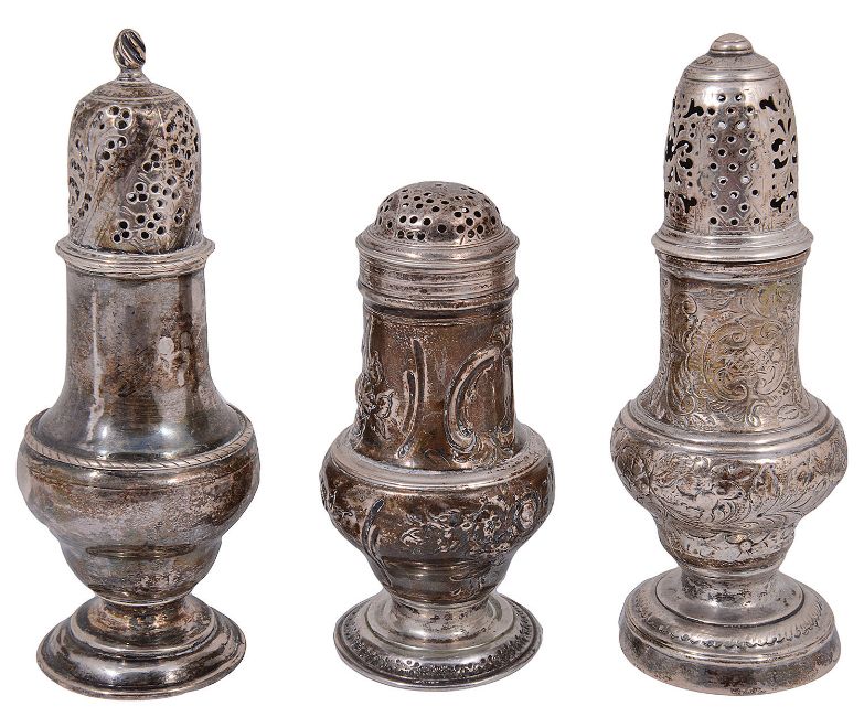 A George II silver bun top pepper pot and two George II silver ogee baluster form sugar casters