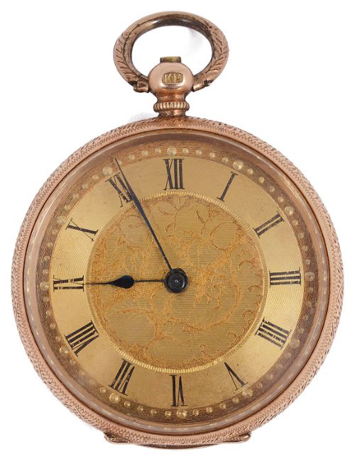 the gold dial with Roman numerals and foliate engraved decoration to centre, case with engraved decoration