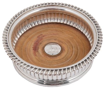 of circular form with gadrooned rim, fluted sides and turned wooden base with central crested button