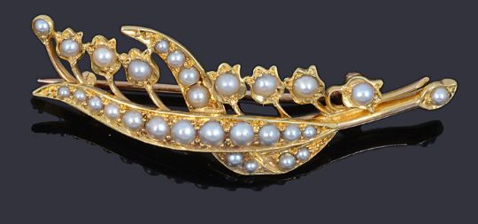 the articulated necklace formed as a swallow in flight with a pearl drop between two foliate branches, stamped 14K to reverse, together with an Edwardian yellow metal half pearl set star pendant with glass locket back, tests for gold, an Edwardian half pearl set Lilly of the Valley brooch, tests for gold and a 15ct and seed pearl pendant brooch (4)