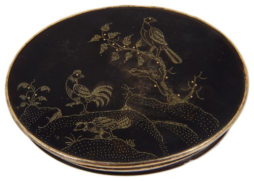 the hinged lid finely decorated with a chinoiserie style cockerel and hens, one perched on a branch, the base with a floral spray