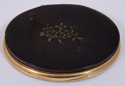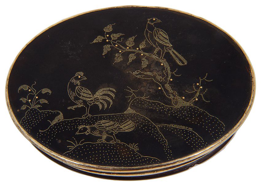An early 18th century gold coloured metal mounted tortoiseshell and pique work oval snuff c.1720