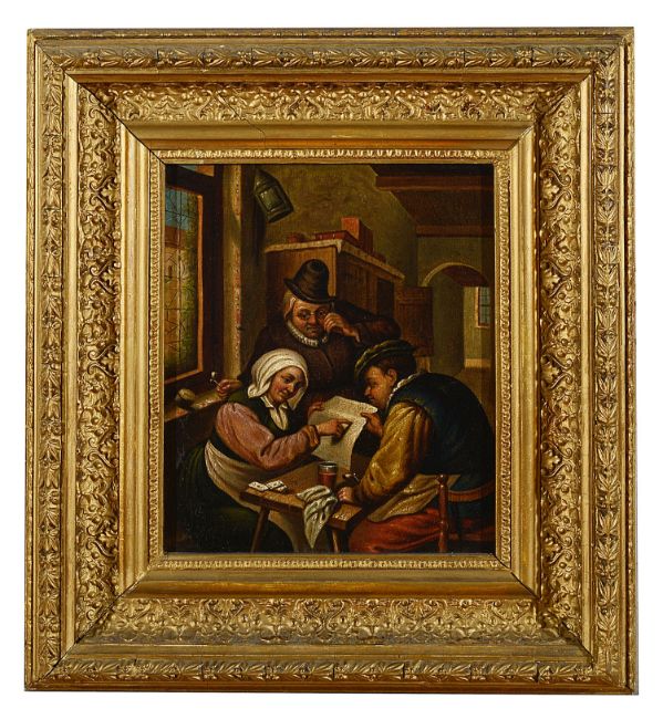 Condition: Card Players with a small area of damage and repair to left of head of seated figure on the left. Areas of craquelure to all three. Two frames with small losses to gesso which are detached but present. 'Card players', canvas 25.5 x 22 cm., 'Journal readers' canvas 17 x 20.5 cm., Frames later painted gold