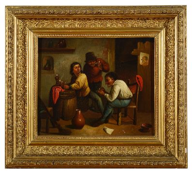 'Card players', 'Pipe smokers' and 'Journal readers', oil on canvas, indistinctly signed, 19th century gilt gesso frames, (3)