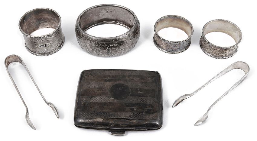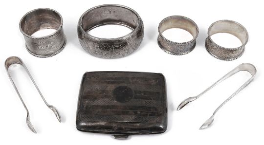 comprising a foliate engraved hinged bangle, Birmingham, 1885 by William Warr, an cigarette case with engine turned decoration, three silver napkin rings and two pairs of sugar tongs, (7)