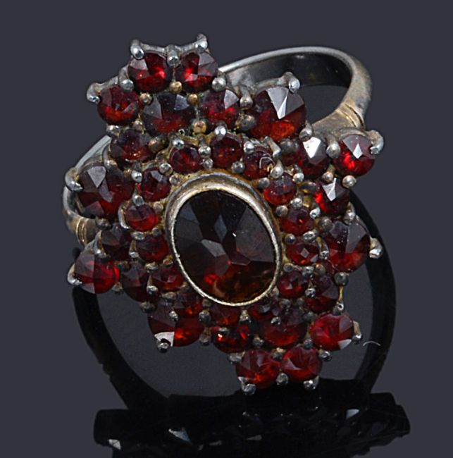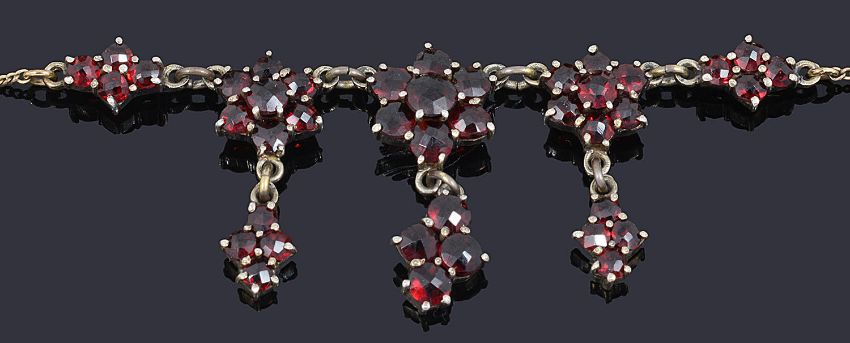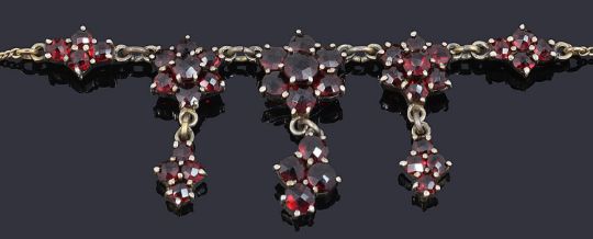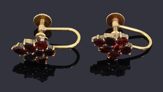 comprising a delicate single row bracelet with fancy push clasp fastening, a garnet cluster ring, mount stamped .900, a pair of garnet cluster earrings, reverse stamped 9ct, a garnet cluster drop necklace and a small garnet button cluster brooch (5)