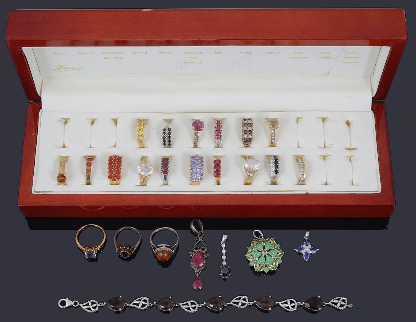 comprising seventeen 9ct gold mounted mixed gem set rings, some with diamond detail, together with a white gold diamond set pendant and two other gem set pendants and four silver mounted similar items, some associated boxes (qty)