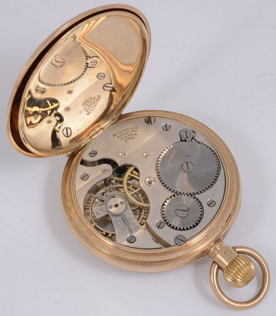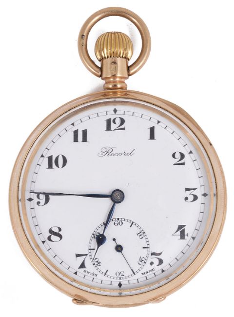 the circular white enamel dial with Arabic numerals, minute track and subsidiary seconds dial, signed Record, 7 jewels Swiss movement