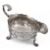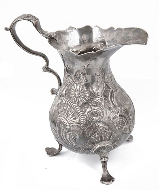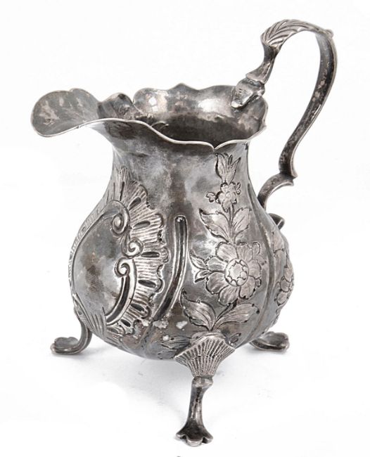 comprising a George II sauce boat with foliate embossed decoration London, 1756 by John Muns, of typical form having wavy edged rim and flying leaf scroll handle raised on three supports with trefid feet, bears later presentation inscription, a George III silver baluster form cream jug with foliate embossed decoration, London, 1964, makers marked H ?, another similar George III silver cream jug, London, 1768 by William Kersill and a Victorian foliate embossed cauldron salt with a blue glass liner, London, 1862 by Daniel & Charles Houle, (4)
