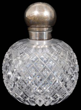 having spherical glass body cut with diamonds, the hinged mushroom cap engraved with initials