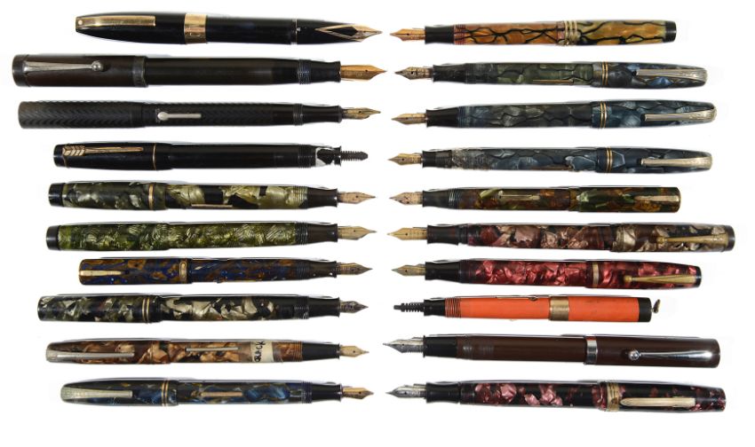 A large collection of mottled and plain fountain pens and propelling pencils/pens dating from 1920s to 1960s
