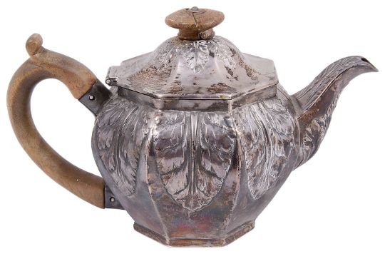 of squat octagonal form embossed with acanthus leaf decoration, having hinged domed cover with fruitwood knop finial and scroll loop handle