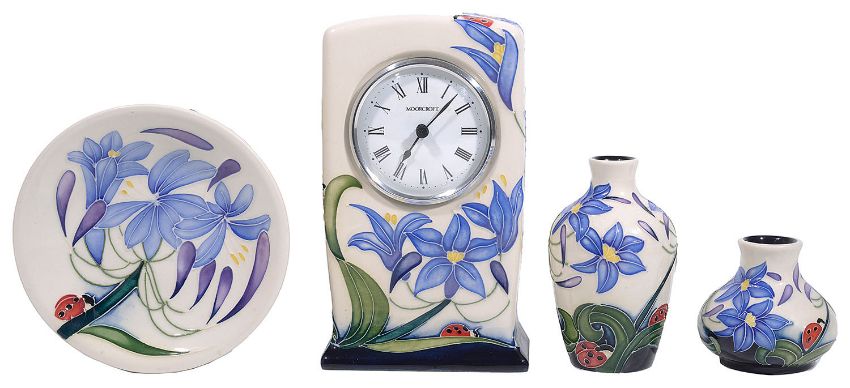tube line decorated with a design of agapanthus and a ladybird against a cream ground, the clock dated 2005 in original box together with a small plate, a small squat baluster form vase, a small ovoid form vase and a small dish, factory marks, (4)