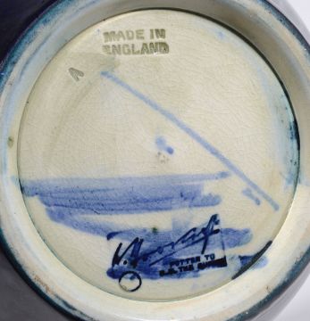 of ovoid form, tube line decorated with pansies against a streaky dark blue ground, impressed facsimile signature and Potter to H.M. the Queen