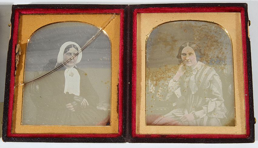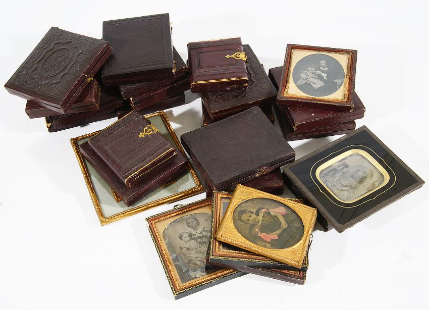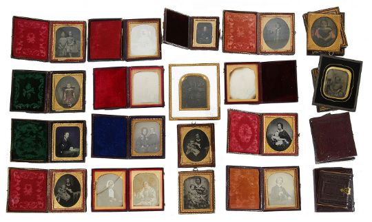 Condition: Double daguerreotype one portrait with a crack the other with foxing. Most portraits in good condition. One ambrotype with craquelure to right hand side. Some cases with slight wear