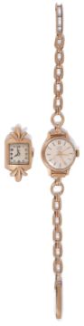 the first with circular silver dial with raised gold hour batons, 17 jewel movement on a 9ct gold flat oval link bracelet with fold over clasp, the second with square white painted dial with gold arabic numerals, 17 jewel movement, (2)