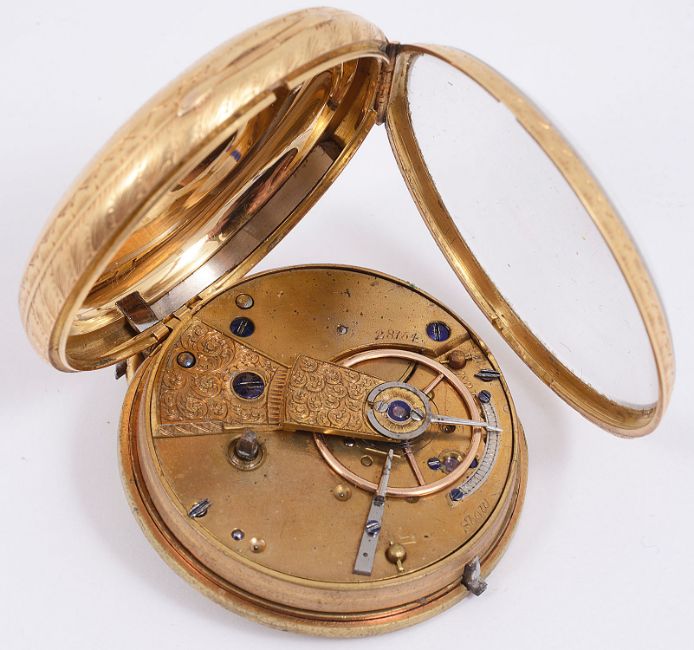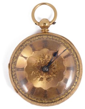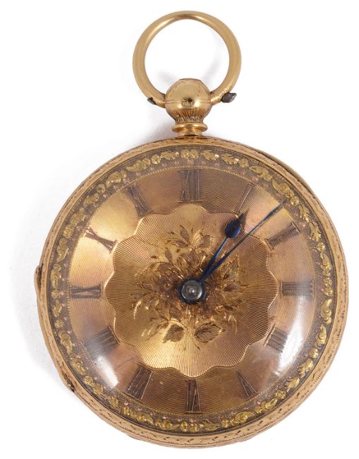 the engine turned gold dial with raised Roman numerals and foliate engraved decoration to centre, the foliate engraved case bearing initials marked for Chester 1858