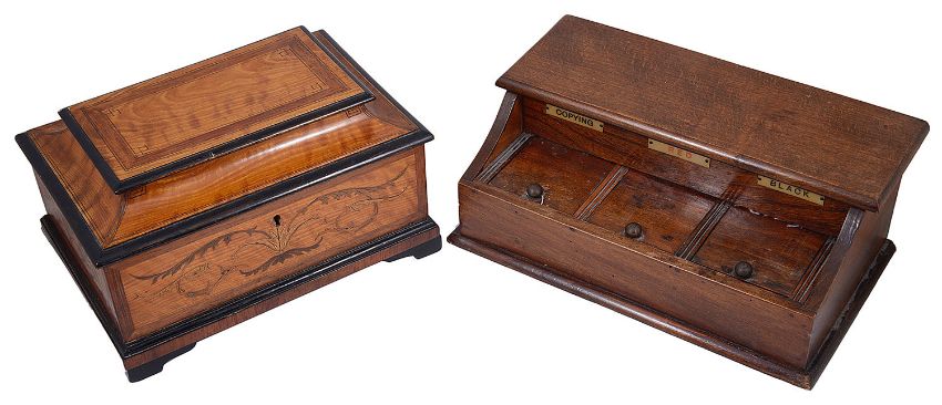 the table box with domed hinged lid, rosewood crossbanded and with ebonised moulded edges raised on block feet, the desk stand with a hinged compartment with glass pen try and three ink wells 'Copying', 'Red' and 'Black', (2)