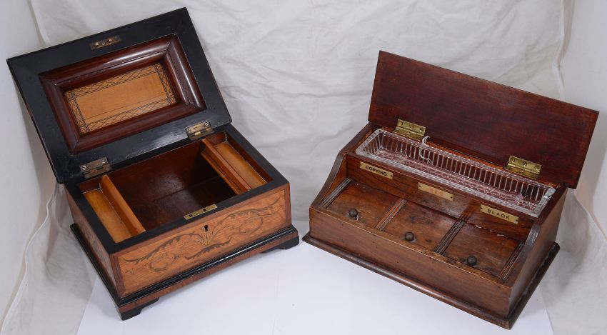 Condition: Jewellery box with one block foot off but present, no key. Some worm holes to desk stand
