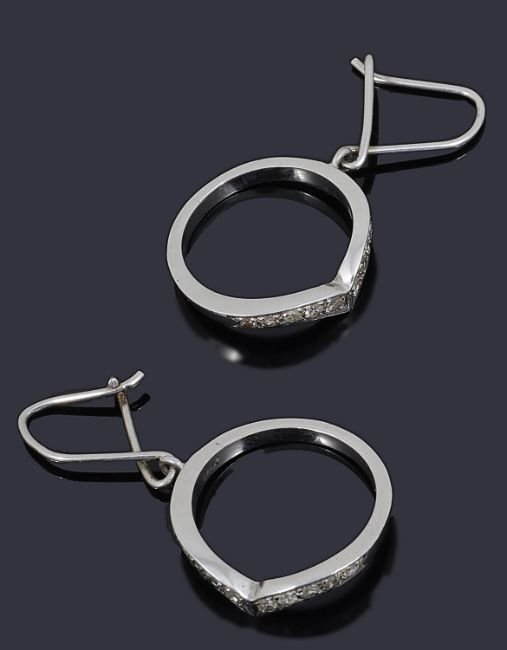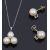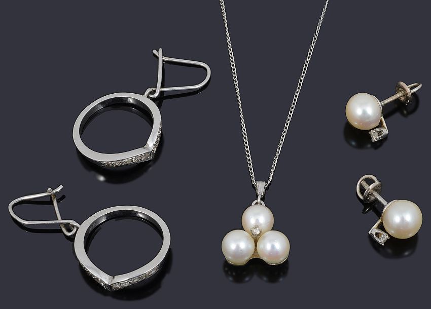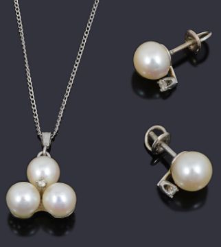 the earrings marked 14K and of wishbone form, each set with ten diamonds, together with a Continental 14K white gold cultured pearl and diamond trefoil pendant on chain and matching ear studs, (3)