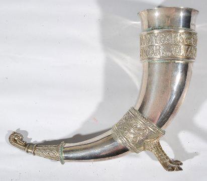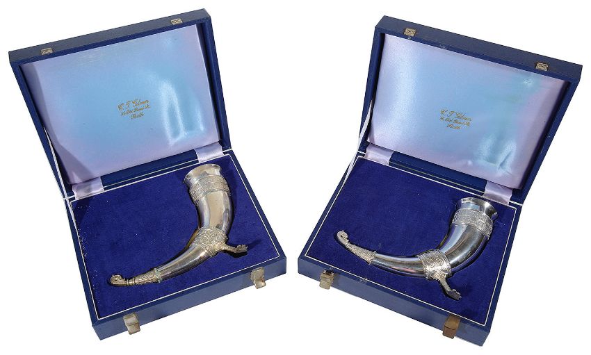 A pair of Elizabeth II silver commemorative rhytons or drinking horns 1000 Years of English Monarchy Edgar to Elizabeth 973-1973