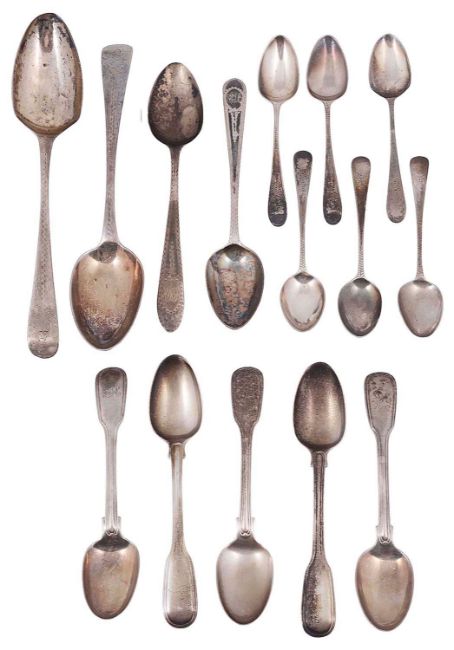 comprising a pair of Irish celtic point pattern bright cut engraved dessert spoons, Dublin, 1786 by John Power, initialled, a pair of bright cut engraved Old English pattern table spoons, 1805 by Peter & Ann Bateman, initialled, a matched set of six bright cut engraved teaspoons, most London, 1786 by Thomas Liddiard, and a set of five fiddle and thread pattern teaspoons, London, 1839-41, by William Eaton, initialled, (qty)