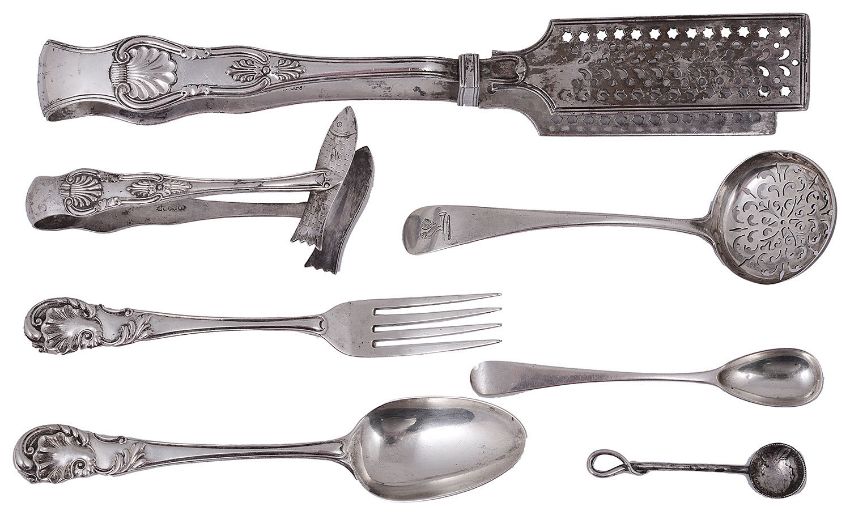 comprising an early Victorian christening fork and spoon, London, 1854 by Mary Chawner, initialled, an Old English pattern sifter spoon, 1885, by Charles Boyton, a condiment spoon, a George II sixpence 1758 whip-end salt spoon, a pair of Old Sheffield plate Kings pattern asparagus servers and a pair of silver plated Kings pattern sardine tongs, (qty)