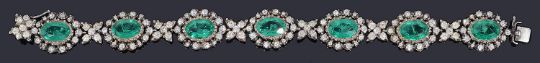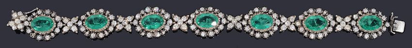 formed of seven emerald coloured and clear paste set oval clusters with floral paste cluster between, part closed setting, invisible push clasp fastening
