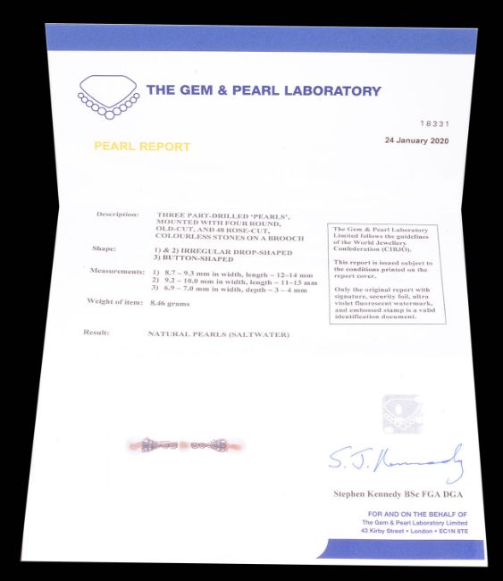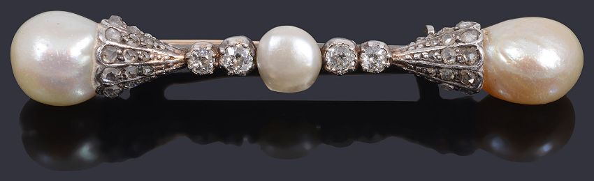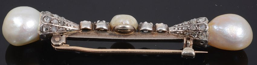 having a natural salt water baroque pearl to either end, each set in a rose diamond set conical mount having central natural button pearl to centre and two diamonds to either side, mount tests gold and silver, the brooch is accompanied by the Gem & Pearl Laboratory certificate stating that the pearls are natural (saltwater)
