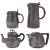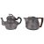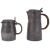 Condition: Teapot with some corrosion to edge of rim and some loss to rattan handle towards base of handle. Underside has also been pushed in. Covered milk jug with damages and losses to rattan handle