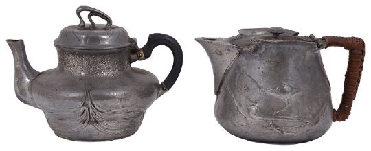 comprising a covered hot water jug model no 0278, a teapot, model 025 and a covered milk jug model 0306, all with stylised decoration and rattan handles, together with a Art Nouveau Orivit pewter teapot, (4)
