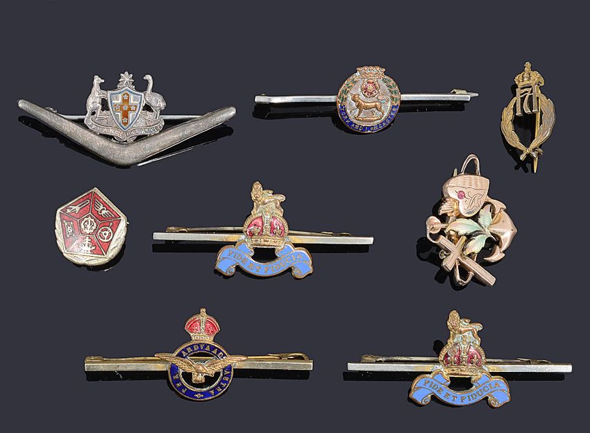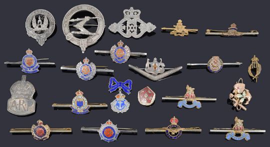 to include a Scottish provincial silver clan badge, Medlock and Craik of Inverness, a gold Royal Artiliary bar brooch marked 9ct, a gold brooch with applied heart, an anchor and cross motifs, a Swedish silver cap pin marked 171, three enamel Royal Engineers bar brooches including two silver examples, a silver 'toujours priest" brooch, a Scottish silver brooch and other military bar brooches (qty)