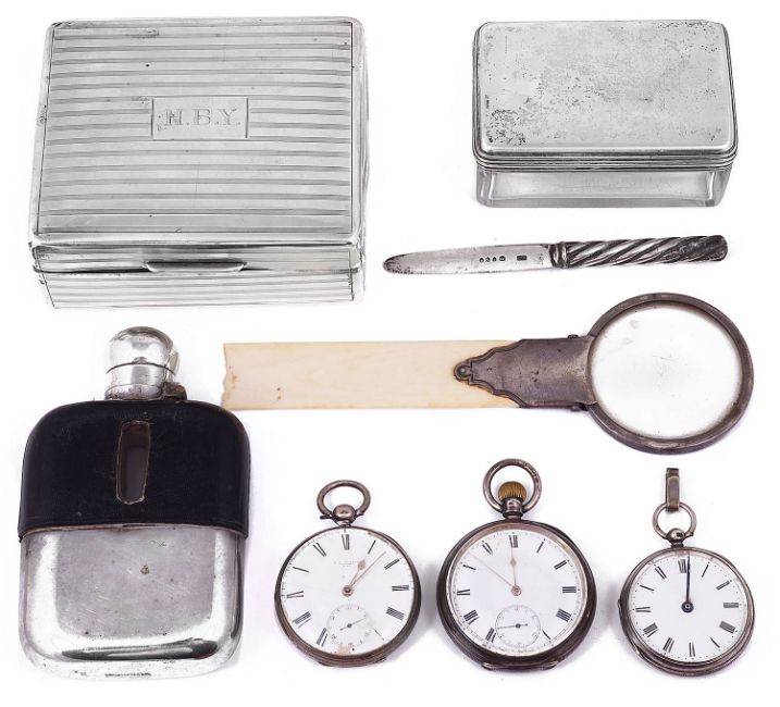 comprising a Victorian letter opener with spiral fluted handle, London, 1888 by Sampson Mordan & Co, a George IV silver lidded glass jar, London, 1827 by Archibald Douglas, a George V cigarette box, London, 1919 by Blackmore & Fletcher Ltd having horizontal engine turned decoration engraved with initials and cedar lined interior, retailed by Mappin & Webb, a silver mounted ivory page turner with magnifier, a silver plated, leather and glass hip flask with hinged mushroom cap and detachable cup, a Swiss .935 cased open faced Waltham traveller keyless pocket watch, an early Victorian open faced pocket watch, the movement signed R.R. Rowell, Oxford, and another, (qty)