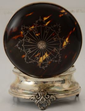 of circular from, having plain spreading sides and hinged domed tortoiseshell lid inlaid with central pique work fan paterae and trailing garlands, raised on pierced and foliate embossed bracket feet, fitted velvet interior