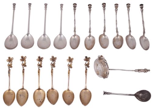 having talon stem, initialled together with a set of six German .800 silver gilt coffee spoons with sprig terminals, an apostle sifter spoon, etc., (qty)