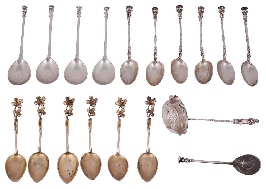 Condition: Fair condition. Smallest odd seal top spoons with blackign and corrosion to bowl and stem. Set of German silver gilt spoons with some wear to gilt and ocasional black spots