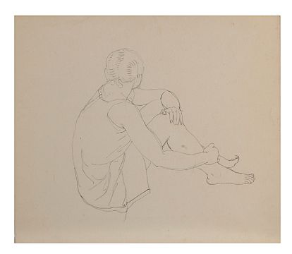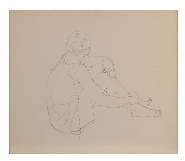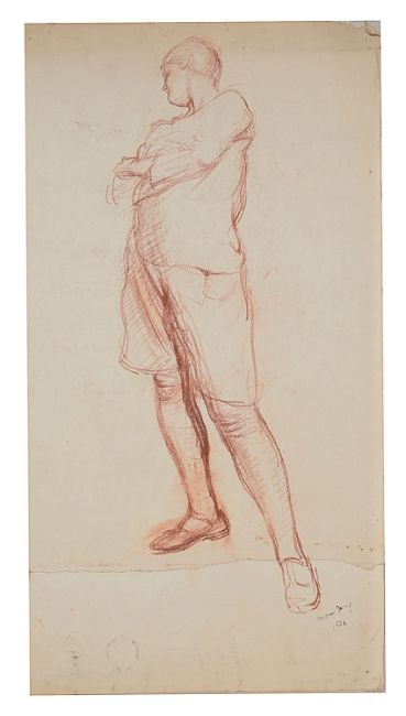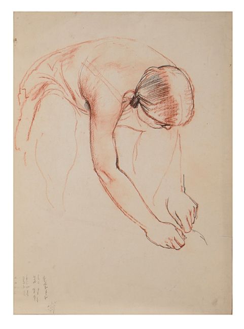 the first a pastel and pencil sketch of a young girl bending over to lace her shoe and two other pastel sketches, a pen and wash and a pencil sketch, another of a figure standing signed and dated William Dring 1926 (5)