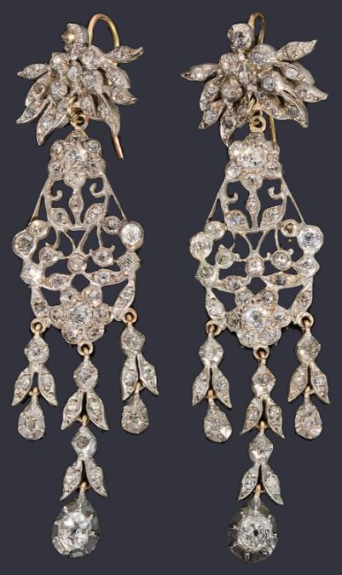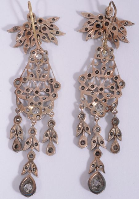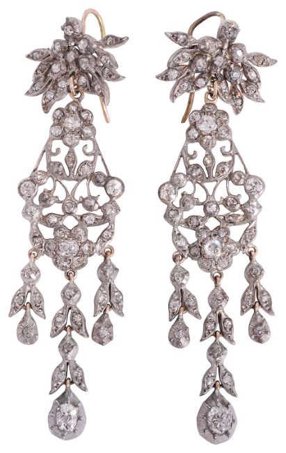 comprising of two floral clusters of old-cut diamonds set around a pierced scrolling frame, with three diamond set articulated foliate drops terminating with a single diamond bud in cut down collets, suspended from diamond-set sprays, mounted in silver and backed in gold with a hook fitting in a Lanson & Sons Ltd fitting box
