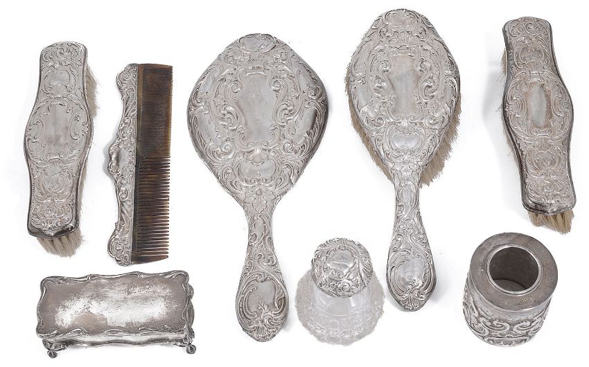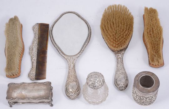 comprising a trinket box, Birmingham, 1903 by Henry Matthews, of plain rectangular wavy edged from, having hinged lid with scroll border and gilt interior raised on legs, a small silver mounted spherical hobnail cut glass scent bottle, Birmingham, 1905 by James Deakin & Sons, having foliate embossed mushroom top and internal stopper, a six piece foliate embossed silver backed dressing table set, Birmingham, 1906 by William Harrison Walter and foliate embossed hat pin jar with frosted glass liner, (9)