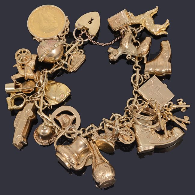 the fancy link bracelet suspended with a large variety of mainly 9ct gold articulated and other charms and a 1918 full gold sovereign in removable pendant mount, charms to include spinning 'I Love You", wishing well, various dogs including a poodle, keys, rings and others, 9ct gold heart padlock fastening